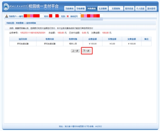 3.进入校园统一支付平台后,选择其他费用,勾选交费业务单信息,点击进入缴费。